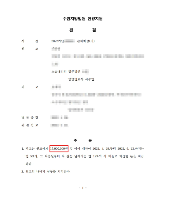 결론적으로 원고는 피고를 상대로 1,500만 원의 손해배상금을 지급받게 되었습니다.