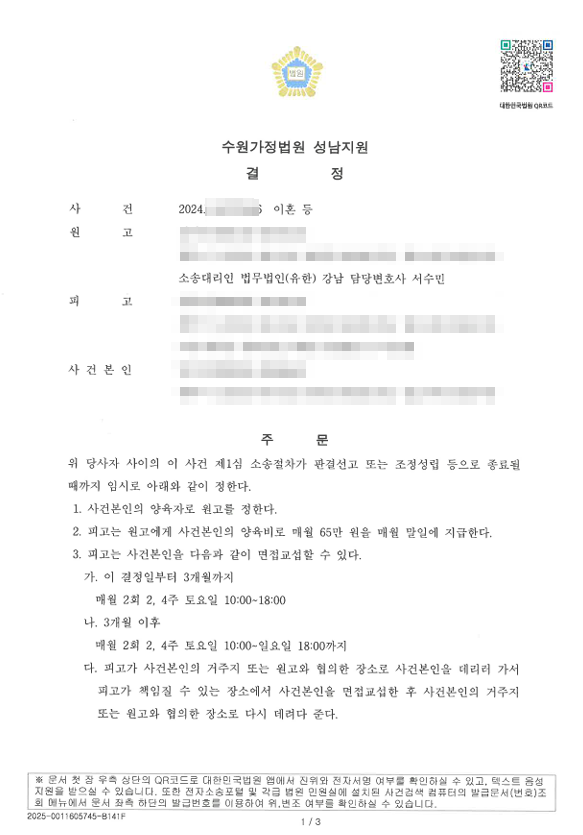 법원은 저희 측의 주장을 받아들여 의뢰인을 임시양육자로 지정하고, 상대방에게 매월 임시 양육비 지급을 명령하였습니다. 아울러 면접교섭은 초반 3개월은 당일 교섭으로, 이후에는 자녀의 의견을 반영하여 1박 2일 일정으로 제한적으로 진행하도록 하여, 자녀의 복리와 의뢰인의 양육권 확보가 균형 있게 이루어질 수 있도록 결정되었습니다. 이는 본안 소송에서 유리한 방향으로 작용할 수 있는 중요한 성과였습니다.